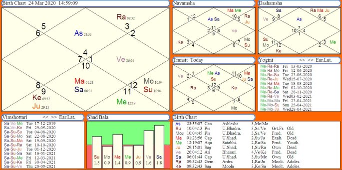 With cancer lagna rising ninth house of horoscope of beloved PM Narender Modi .Ninth house represent present punyas. With the result accumulated present punyas of this life of PM Narender Modi India will be saved from havoc of epidemic named covid -19.Cancer lagna lord moon in ninth house of dharma which will raise the spiritual values in people of india and will save them from covid-19 epidemic .Since their is no relation between sixth lord Jupiter with PAC [position aspect conjunction] with lagna lord moon so covid-19 will break down in between when sun will enter aries sign .Sixth lord represent disease and moon represent body of india in nav samavatsar 2020.See the position of d-9 navamsha with Aquarius lagna rising with Saturn own house in lagna shows the strong will of king PM Narender Modi to get india out of this problem.In Nav Samvatsar 2020 shows affliction to lagna lord moon through sun and aspect of Saturn from seventh house .Aspect of Saturn and Mars on lagna indicate panic to public whole year .