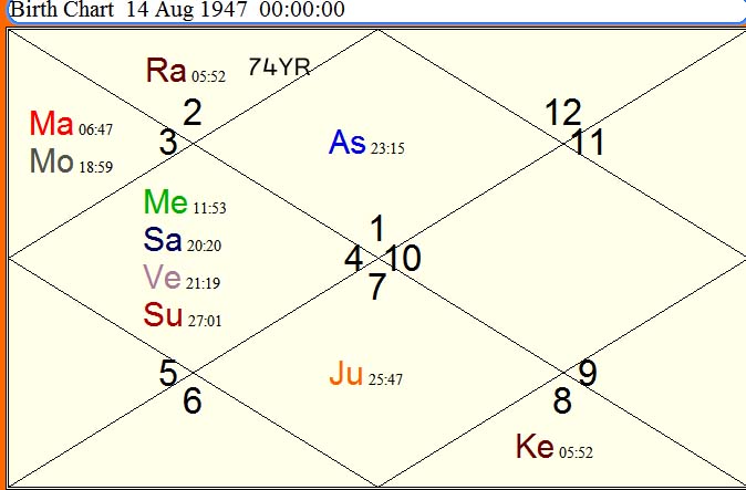 The another angle in this artcle is Pakistan with which india will have possible conflict or war like situation this year in 2020 .Pakistan got independence from united kindom in 14-8-1947 ,12-01hrs ,karachi.With aries lagna, lagna lord mars in third house with forth lord moon indicate aggressiveness right from its birth to occupy Kashmir and to disintegrate india .But it will remain a dream now because Pm Narender modi is at centre.