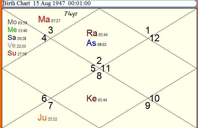India got independence on 14/15 aug-1947 midnigth at 00-01 hrs at new delhi .India has got Taurus or vrish lagna ,with lagna lord in third house with four planets sun ,moon ,Saturn, mercury with venus .All five planets in third house which is also the house of neighbor countries .With affliction to venus by papkatri yoga with degree wise saturn behind venus and sun is ahead of venus .Due to this combination india is rightly in trouble from its birth from pakistan and china .