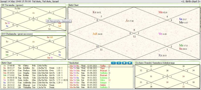 Anter of Venus :At present Israel is running in anter of Venus is very crucial for Israel due to opposition from Jupiter .Venus is in hasta nakshtra of rahu in eighth in sign of mars. So directly or indirectly Venus is connected with two malefic rahu who is in sign of mars war mongering planet in twelfth house .Venus is also in twelfth house from moon sign aspect by sixth lord Jupiter the planet of dispute and trouble with Arab world specially Iran .See position of Venus in navamsha d-9 badly hemmed between sun and Saturn degree wise Saturn ahead and sun behind .Sun is twelfth lord and Saturn in sixth lord of fight and dispute .If this ignition take place in anter of Venus Israel will not stop here.As this combination of Venus ,Sun Saturn in taking place fifth house of emotion and public sentiments of Israel in navamsha d-9. .This combination signifies Israel is fully loaded in war mood with Iran .Venus is in twenty three ashtakvarga point .This is very below average .Note Venus is in Mrityu Bhaag 00:39 mint second away from sensitive point.