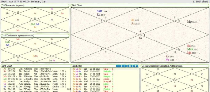 Iran :Iran come into existence on 1-4-1979 ,at 15 hrs Tehran with cancer lagna with ninth lord in lagna exalted Jupiter .Lagna lord moon is in eleventh house of gain aspect by Saturn indicate gain from oil and natural gas. Navamsha is Aquarius which is eight house of birth chart indicate permanent obstacles in growth.