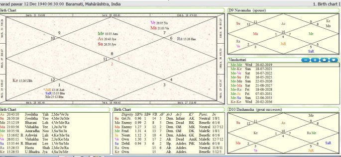 Mercury mahadasha lord is eleventh and eighth lord .Since with the start of mercury mahadasha from 20-2-2019 the political career again taking shape by becoming king maker in forming government of Maha Vikas Agadhi from 26-11-2019 with his party NCP ,Congress-I and Shiv Sena forming alliance to form a State Government in Maharashtra .Since mercury is eighth lord and eleventh lord with tenth lord in lagna .Mercury nakshatra lord is Saturn in sixth house debilitated. Debilitated planets are good in 3,6,11 houses according to Maharishi Parashar. Saturn is also participating in Rajyoga with Jupiter. Mercury is eighth lord with tenth lord Sun so longevity of Mahavikas Agadhi Government whose king maker is Shri Sharad Pawar is doubtful .This mercury is in tenth house in d-9 navamsha as ninth lord aspect by mars fourth and eleventh lord. Saturn retro also aspect mercury in tenth house from eighth house. Due to this combination Shri Sharad Pawar as king maker of Maha Vikas Agadhi will be be disputed as lot of conservatories surrounds on this Government. Mercury is eighth lord of birth chart it may prove bad for health of Shri Sharad Pawar. Another good aspect of Mahadasha of Mercury is that Shri Sharad Pawar will shift from state politics to center politics ,but this mercury is in aspect from Saturn from eighth and mars from fourth house so it is afflicted .People on national political stage may take use of his position in which Shi Sharad Pawar is in present .In birth chart mercury is in eighth house from moon lagna with fifth lord Sun. Mercury is eighth lord with tenth lord Sun it indicate change of place in profession .He will be brought to lime light as king maker from state politics to centre politics against PM Narendra Modi in centre. Mercury mahadasa is placed in twenty nine ashtakvarga point which is above average, But not much will come out at centre politics as fellow people will deceive him due to eight Saturn aspect tenth mercury in d-9 navamsha chart.