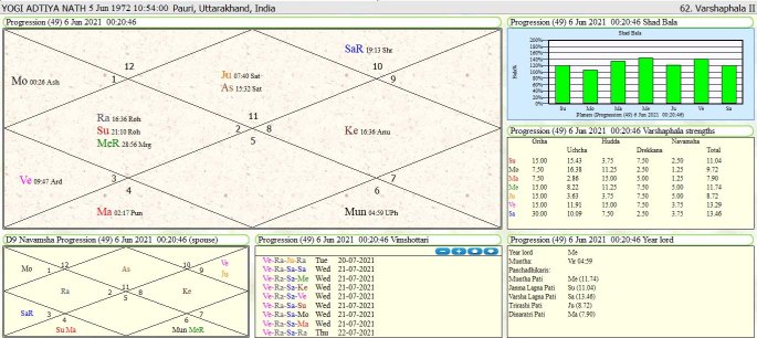 Rahu anter from 21-10-2021to 8-11-2021:Rahu anter lord in the horoscope of Yogi Aaditya Nath is posited in sixth house of enemy, fight and disease .We know it well known fact that in this anter CM Yogi Aaditya Nath has suffered from covid-19 .Rahu in sixth house is described by Maharishi Parashar as malefic .Rahu as malefic in sixth house first create enemy in front of him then defeat him in direct confrontation .Yogi Aaditya Nath’s party BJP has latest win in Zila Panchayat election.Rahu is in sign of Saturn. Saturn natal sign lord of Rahu is in tenth house in opposition with sun lagna lord and also conjunct with mercury eleventh lord of gain .Saturn sixth lord is combust with nearness with sun. Combustion of sixth lord will finish his enemy or rivals..Rahu Ashtakvarga point is twenty seven that is good because it is below average.His enemy will not grow in this anter of rahu.Rahu in d-9 navamsha chart is in tenth house in house of Saturn placed in second aspect by mars from eleventh house of gain. Tenth house indicate professional rise.In d-10 dashmansha chart rahu is in second house in libra sign with eleventh lord of gain aspect by Jupiter. Sign lord of Rahu is Venus in lagna debilitated indicate some trouble and problem by enemy.