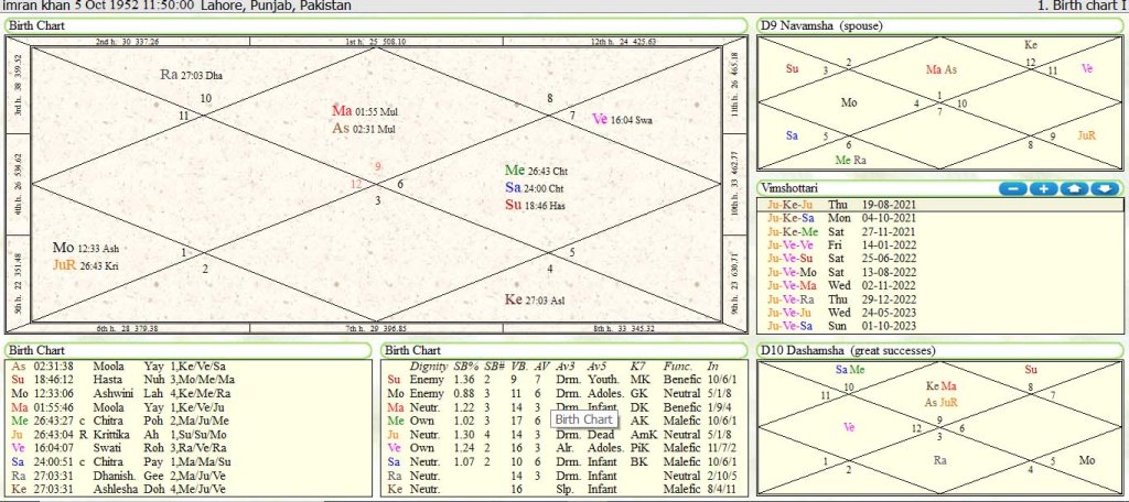 Pakistan Prime Minister Imran khan: Imran khan Pakistan prime minister is rejoicing these days as his little success in supporting Taliban in Afghanistan. Imran khan has Sagittarius lagna with lagna lord in 5th house conjunct 8th lord moon aspect venus 6th and 11th lord. Great signification is attached with specially 6th lord which is lord of fight ,enemy trouble from enemy of Venus and secrecy of 8th house concerned with Moon