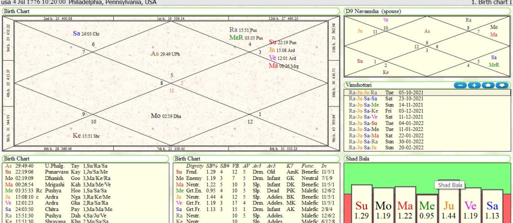 3] Jupiter aspect to 3rd house by 9th aspect will help USA to maintain cordial relation with neighbour countries and it will develop its supremacy in the world.