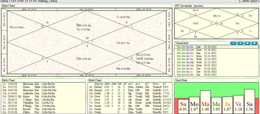 Bhrigu transit: Jupiter in transit in 2nd house is aspect by Saturn and mars two hard core malefic .Saturn as sign depositor of transit Jupiter as 2nd lord of finance in 8th house bad house[trikh bhav] will result in spending of money or finance in secret projects to sabotage economy of different countries.But mars as debilitated aspect transit Jupiter in 2nd house .China’s opponent countries will fail all his plan to sabotage their economy .Moreover his plan to capture the economy of Afghanistan will be a total failure .Natal Jupiter is aspect to natal Saturn [sign depositor of transit Jupiter] as 12th lord from 12TH house means heavy expenditure which results in loss in which different plans executed by Chinese government to capture world economy in their hand.