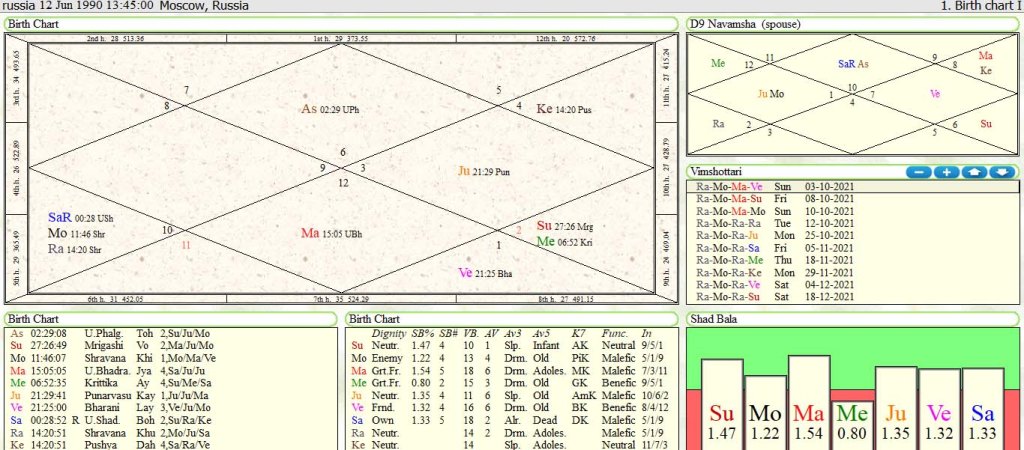 Bhrigu transit:Jupiter is in transit its natal despositor is natal Saturn in 5th house of thinking and ideology also aspect aspect to transit Jupiter in retro motion .Natal Saturn is conjunct with Moon and Rahu. So there will shift of power equation of Russia from India ,America,japan ,Australia group of quad towards china ,Pakistan ,Afghanistan block .It is due to Rahu and Saturn in 5th house shift of power equation towards Islamic block which is lead by china. Jupiter aspect on transit Jupiter in Aquarius is 6th house from 10th house represent by India influence over Russia which will hampered by aspect of natal mars in 7th house represent by China on natal Jupiter in 10th house. Russia will more inclined towards China as compared with India.