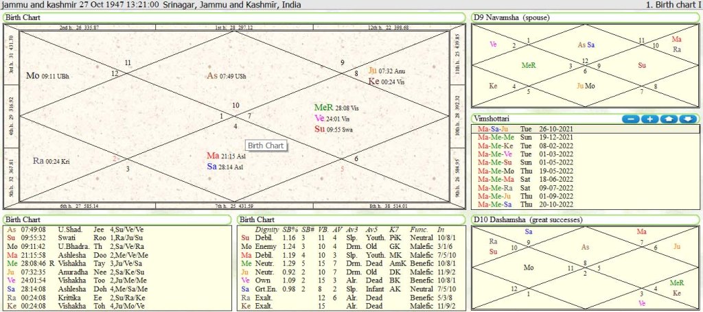 Mahadasha of mars :Mahadasha lord mars is in debilitated 4th and 11th lord shows creation of Jammu and Kashmir without article 370and 35a which represents the change demographic change in its boundaries through legalisation in Parliament. .Ladakah and kargil is now union territory which once were part of Jammu and Kashmir. Fourth house shows land and 11th shows legislation passed by parliament of India to abolish article 370and 35a of Jammu Kashmir. Mars is 7th house of open war indicate there will never be peace till Pakistan in disintegrated into number of pieces till 2024 and 2025 year has come in future which I have indicated in Bhrigu Jeev Nadi in series of article on Afghanistan .Mars is in navamsha in Capricorn as 9th lord of religion conjunct with Rahu shows domination of majority community represented by Rahu [yawan] there will lot of fire fights in coming time in Mahadasha of Mars.