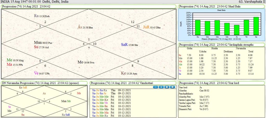 Moon Mahadasha :Moon Mahadasha lord is 4th lord posited in 7th house aspect by malefic Saturn shows disturbed public sensitivity due to covid-19 omicron variant in time to come in form of third wave in India. Moon is karka for sensitivity which shows public sensitivity in form of panic at the time of third wave in India in time to come. Note affliction to moon in birth chart of varshphal by Saturn and again in d-9 progression navamsha of seventy fifth year varshphal in 5th house conjunct with venus ,aspect by Saturn and mars.