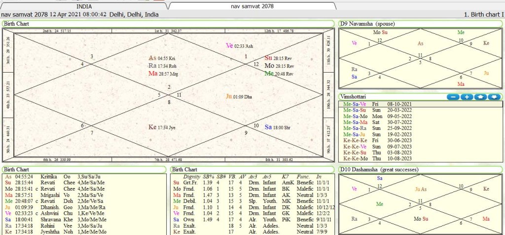 Vikrami samvat 2078: Present running vikrami samvat is 2078 which started on 12-4-2021 at8:00:42 hrs Delhi. Samvat 2078 is badly afflicted due to placement of lagna lord in 12th house and exchange of 12th lord mars with lagna lord venus is not good .Two hard core malefic are conjunct in lagna which is Rahu and Mars two hard core malefic is not good. Both luminary Sun and moon are also afflicted