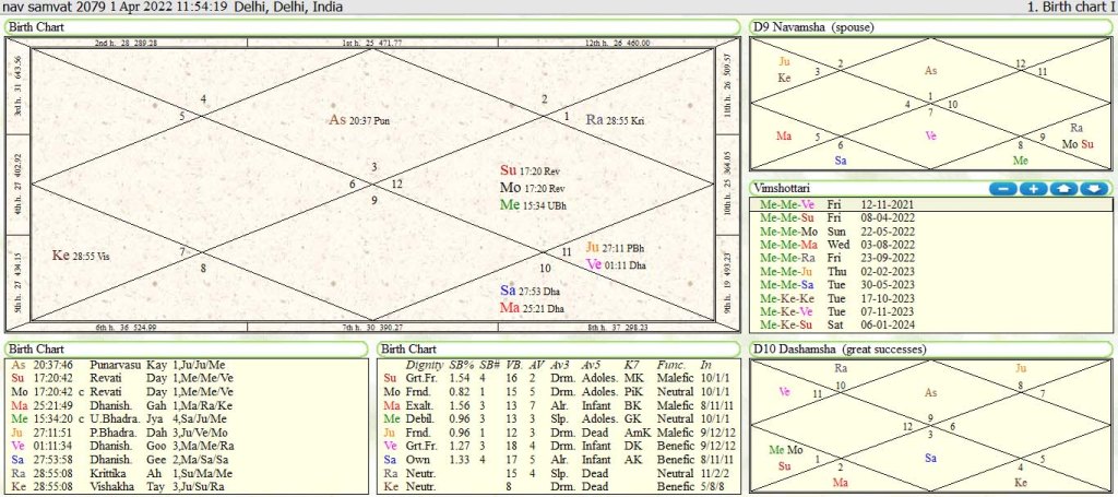 Samvat 2079:In samvat 2079 lagna lord mercury is posited in 10th house conjunct with 2nd lord moon and 3rd lord sun which represent communicable disease like covid-19. Here running pratyaanter is again venus which is running at start of samvat 2022.Venus is 5th and 12th lord in 9th house shows slowing down of covid at that time due its conjunction of dev guru Jupiter .