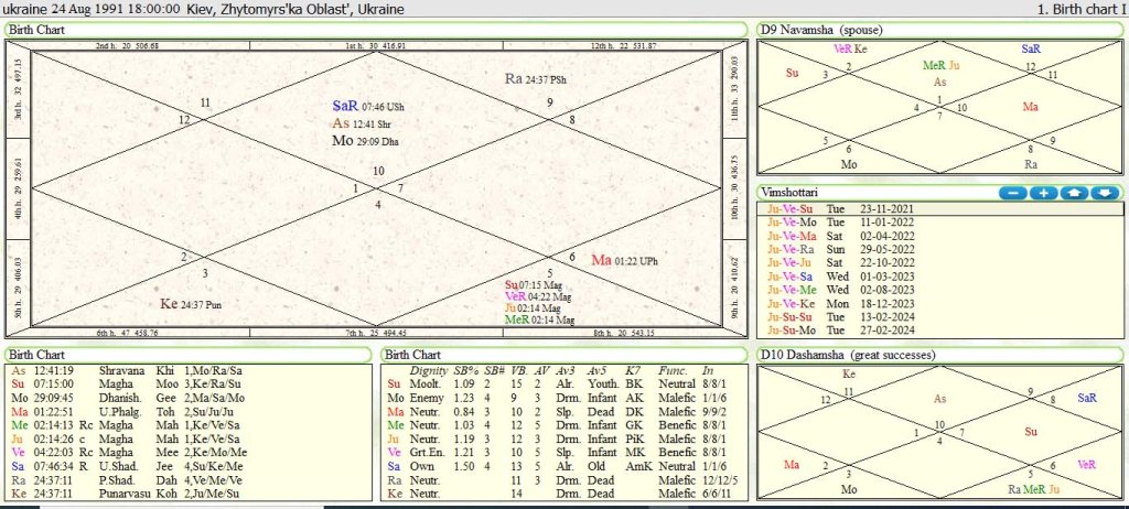 Jupiter Mahadasha lord is posited in 5th house as 3rd [neighbor country Russia]and 6th [fight]lord aspect by Mercury ,Mars,Sun .since .Mars is karka of violence and Sun is 11th lord of gain and Mercury as 9th and 12th lord .Clearly shows Russia war aggression against Ukraine in Mahadasha of Jupiter .Jupiter in navamsha d-9 is in 12th house conjunct with lagna and 6th lord mars [arms and ammunition ]also shows full military support of America and to counter Russia aggression.