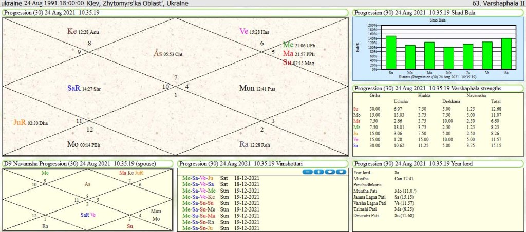 Present Varshphal Of Thirty First year: With Libra lagna rising with lagna lord in twelfth house in debilitation clearly shows panic in Ukraine against Russia aggression. but lagna lord in 12th house shows foreign help in the form of America and NATO forces. Lagna is aspect by yogkarka retro Saturn is good sign .Muntha is also aspect by Saturn retro 4th and 5th lord. Muntha lord moon is 6th house aspect by Saturn shows preparation of war but aspect of Saturn on moon and muntha shows uncertainty in the public of Ukraine against mounting pressure of Russia on Ukraine.
