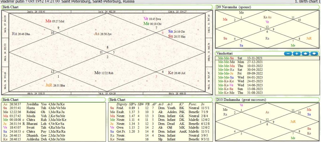Pratyaanter Dasha of Sun: Sun pratyaanter lord in 10th lord In the horoscope of Vladimir Putin badly afflicted by conjunction with 3rd and 4th lord Saturn .This small pratyaanter which will finish on 27-12-2021 which is not long to excite Putin to rage a war against Ukraine.
