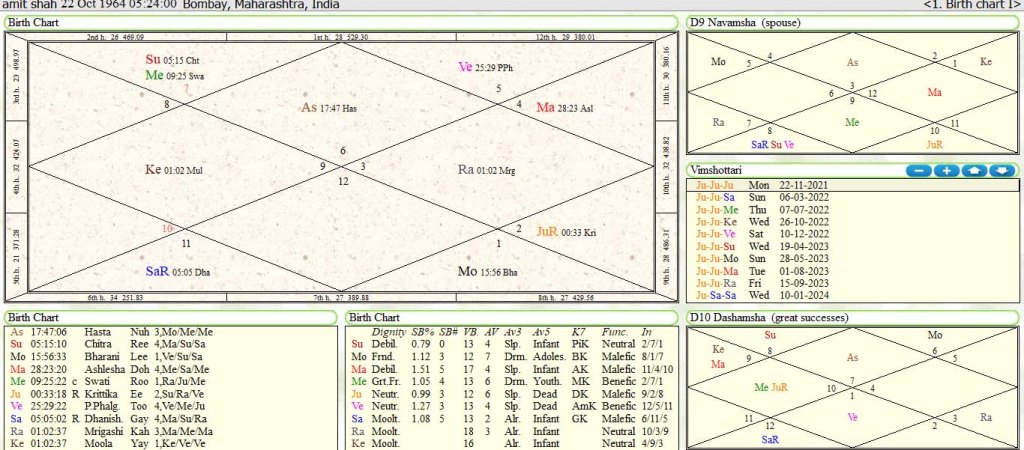 Jupiter Mahadasha lord impact on coming election of five state assembly election in second quarter of 2022.jupiter will definitely help Home Minister Amit Shah due to its lord as 4th and 7th lord posited in 9th house of luck .Jupiter is well placed in d=10 dashmansha chart as 3rd and 6th lord conjunct with benefic 9th and 12th lord mercury aspect to 10th of profession of Home Minister Amit Shah.
