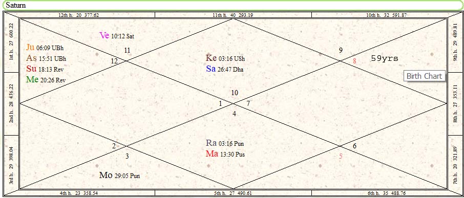 Progressive Saturn :Saturn is karka for profession in Bhrigu astrology.In progression 59th year from Saturn will reach to 11th house Saturn lagna which contain Scorpio sign .Scorpio sign is vacant but aspect by Jupiter 12th from Saturn lagna is aspect to 11th house afflicting it. Twelfth sign represent loss. Eleventh lord mars from Saturn lagna is mars debilitated in 7th house from Saturn in Rahu –Ketu axis badly afflicted .Seventh house represent opposition .So opposition of Channi will not let him work properly and Channi will loose at the hand of opposition in next coming election in Punjab in 2022. Since 11th house represent gain but when it is afflicted it will give loss of position and controversies when afflicted .At present we have seen since CM Channi after becoming CM of Punjab is facing problem and trouble.