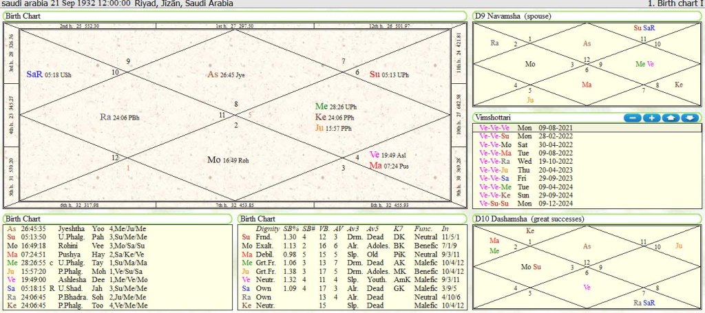 With Scorpio lagna rising at 26degree45mintues with Rohini nakshtra as moon nakshtra.Lagna lord mars is posited in 9th house conjunct with Venus 7th and 12th lord Mars is opposed by Saturn 3rd and 4th lord in 3rd house in Capricorn .Opposition of Saturn and Mars and affliction to Venus is not a good sign for Saudi Arabia.It is due to reason because mahadasha of Venus has just started on 9-8-2021 to 9-8-2041 a long mahadasha of 7th and 12th lord which show the unending tales of conflict which will start with Venus mahadasha from 9-8-2021.