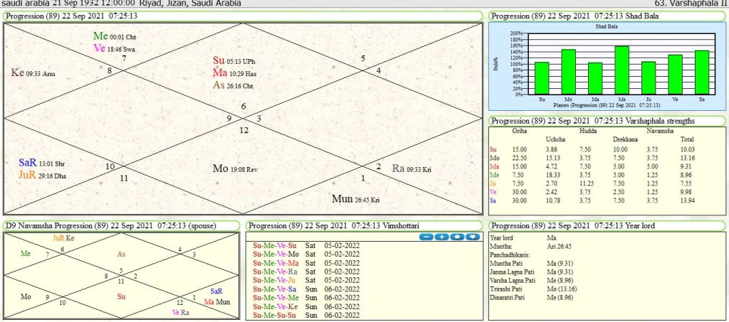 In present varshphal of 90th year of Saudi Arabia Virgo lagna is rising which is 11th house of birth chart .It contain Mars and Sun. Both are malefic for Virgo lagna. Whenever mars is attached with lagna or lagna lord in this varshphal of nation that indicates year of violence and trouble for nation. In Virgo lagna Sun and Mars both are 12th and 8th lord respectively lord of bad houses which indicate problem and trouble to Saudi Arabia. Moreover twelfth lord Sun which represent expenditure conjunct with Mars which is karka of arms and ammunitions purchased by Saudi Arabia from this year. Muntha is in 8th house aspect by mars 8th lord and also karka of war and violence which is going run in whole running varshphal of 90th year .Muntha is aspect by two benefic planets Venus and Mercury which is providing protecting influence to Saudi Arabia in this year .
