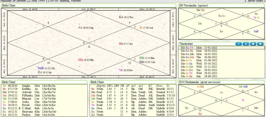 Pratyaanter Of Venus.:Venus pratyantaer was running in the horoscope of Yemen .Rahu-Venus and Venus-Rahu are sensitive in respect of sudden rise and sudden fall in the horoscope of nation.Venus pratyantaer lord is posited in 8th house aspect by Saturn from 6th house of dispute and attack and trouble by Saudi Arabia. Venus is again afflicted in d-9 posited in 11th house as 6th lord conjunct with 8th lord Jupiter and 4th lord Sun aspect retro Saturn in not a good indication for Yemen.