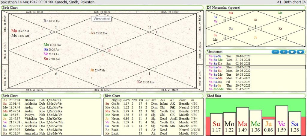 Pakistan these day is running in grip of political l instability .Pakistan army chief is Qumar Javed Bajwa has asked Pakistan present prime minister Imran khan to step down from post of prime minister. On 3-4-2022 Pakistan speaker has dissolved national assembly .Now the matter is in the Supreme court of Pakistan. Pakistan is will be running in fragile democracy in present and also in future. but bad days of Pakistan has been started with start of vimshotari mahadasha of venus –and anter of Saturn from 20-10-2020 to21-12-2023.For more accurate analysis we have analyze the foundation horoscope of Pakistan combined .