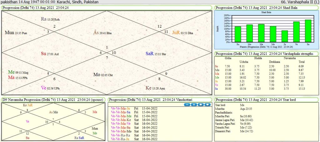 From lagna : Pakistan is running the 75th year in progression which comes to 3rd house with Gemini sign in progression .Gemini sign contain mars and moon combination in which mars is lagna and 8th lord and moon is 4th lord of domestic peace. Gemini sign lord mercury is in exchange with moon 4th lord .Third lord mercury in 4th house indicate danger to king or throne of king. Fourth lord moon which represent throne of king is in 12th house from 4th house with 8th mars in 3rd house .Only aspect of 9th and 12th lord from 7th house can save throne or seat of Imran khan in Pakistan in 75Th year running in Pakistan foundation horoscope. It has very low survival for Imran khan government because military in Pakistan is fully supported by America and Imran khan government is supported by China. So there is very low survival for Imran khan government to survive in Pakistan .But present running year and next 76th year will provide trouble to Pakistan .Seventy six year contain Sun and Saturn with Venus hemmed between Sun and Saturn which will provide financial bankruptcy of Pakistan.