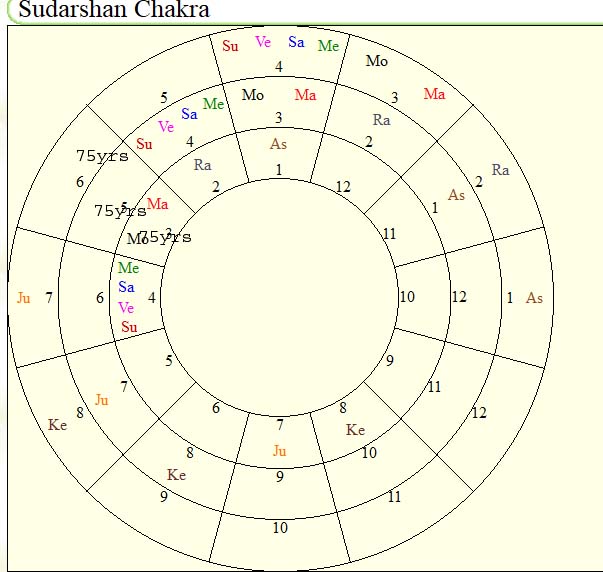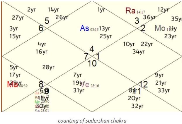 [Sudershan chakra in very simple manner. First year represent fist house ,second year represent second house so on keep on counting up to twelfth house .Then thirteen year comes to lagna fourteen year comes to second house and twenty forth comes to twelfth house .Twenty fifth year again lagna like this keep on progressing ]