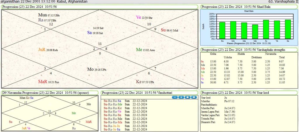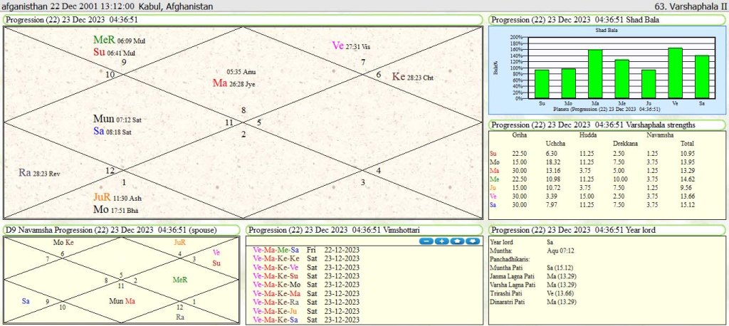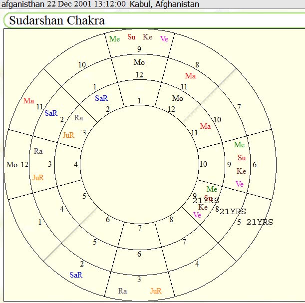 FROM LAGNA:In Sudershan Chakra of Afghanistan is in 21ST year in progression is running from lagna which comes to 9th house which contain Sagittarius sign which contain Mercury ,Sun,Ketu Venus and 9th lord Jupiter is posited in 3rd house of neighbor countries. In Afghanistan major battles between Taliban and Panjshir led by Ahmed Masoud has taken place between May and June 2022 which is 5th and 6th month counted from Sagittarius sign which is from 22-12-2021,fifth and sixth comes to Aries and Taurus sign .Aries sign lord mars is in direct aspect from Saturn retro 2nd house which has lead to direct confrontation or fight between Taliban and Panjshir lead Ahmad Masoud.This same happen in june 2022 which is 6th month from Sagittarius sign in which same event of fight take place between Taliban and Panjshir resistance front.