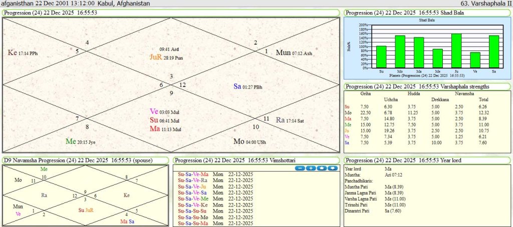 Twenty Fifth Year: With Gemini lagna rising as an ascendant and lagna lord in 6th house of fight ,dispute and border fights .Tenth lord which represent government working has Saturn 8th is mutual aspect with mars sixth lord. What does this indicate maybe possible terrible fight for survival for capturing centre of government between Taliban with Pakistan or Ahmed Masoud of Panjshir .See 10th Jupiter in lagna gain aspect by 6th lord mars from 7th house of open war indicate great instability in Afghanistan in coming year