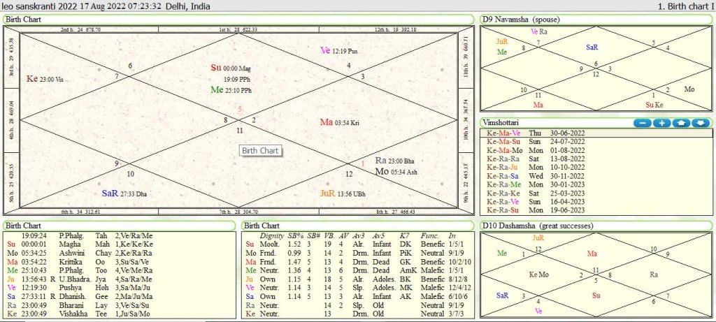 Leo Sankranti: Leo Sankranti will start with entering of Sun in Leo sign on 17-8-2022 at 7:23 Delhi ,with lagna lord Sun in lagna and Mercury as 2nd and 11th lord conjunct with Sun indicate good flow of FDI or increase of Forex Reserve in India. Again see the influence of moon as12th lord conjunct with Rahu karka for poison which will again be providing communal disturbance in India. Clearly source will be Pakistan which is represented by Moon 12th lord conjunct with Rahu in 9th house of religion .See affliction to lagna lord Mercury in D-9 navamsha chart in 3rd house conjunct with Jupiter retro but Saturn aspect lagna lord Mercury and Saturn retro posited in lagna as 6th lord of fight ,disease ,dispute. Mars as 3rd and 8th lord aspect lagna and Saturn 5th and 6th lord posited in lagna in d-9 navamsha chart .There can be rise of terrorism in this Leo Sankranti .Mars aspect both in lagna and D-9 navamsha chart but in much worse way in d-9 navamsha chart will lead to terrorism in jammu and kashmir and many communal outrage [disturbance] which will be in this Leo Sankranti. Rise of covid -19 may see possible outcome of Saturn as 6th lord in Lagna and aspect of Mars on Saturn retro in lagna from 6th house.