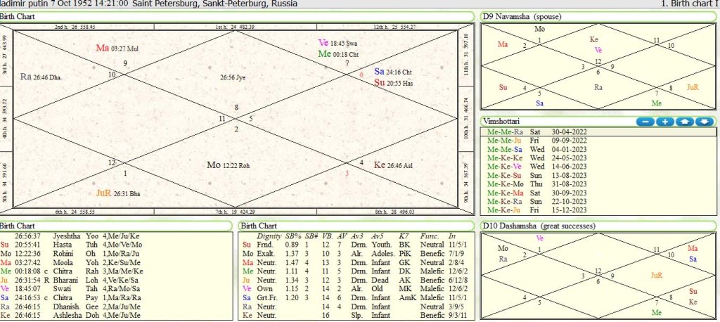 President Vladimir Putin: President Vladimir Putin has been unsolved puzzle for western world due to resistance president Vladimir Putin is providing to western world. He is main figure in Ukraine- Russia war. President Vladimir putin has got Scorpio lagna with lagna lord posited in 2nd house. Mars in retrogression on30-10-2022 to 13-1-2023 will transit Gemini –Taurus sign .Mars will retrograde on 30-10-2022 in Gemini in 8th house. In eighth house retro Mars in transit will be aspect by natal Mars from second house. Natal Mars aspect on transit Mars will ignite the war thirstiness of President Vladimir Putin will rose to next level against Ukraine and western world. When ever natal mars will aspect transit Saturn ,Jupiter and Mars in transit will ignite the violence ,terrorism, fights and war between nation in mundane astrology from Bhrigu view point. Sign depositor of transit Mars is Mercury is twelfth house with natal Venus in not good. But at the same time it is producing Vipreet Rajyoga for President Vladimir Putin. Natal Saturn also aspect transit Mars in retrogression from 30-10-2022 to 13-1-2023 will produce considerable good result for president Vladimir Putin in taking big action in war against Ukraine and western world. Natal Saturn is aspect to transit Mars from 11th house of gain as 3rd and 4th lord conjunct with 10th lord Sun in 11th house .Transit Mars will change sign from Gemini to Taurus where It will enter 7th house in transit. Here transit Mars in retrogression will on natal exalted Moon which is 9th lord of luck. This is good transit for president Vladimir Putin .His transit Mars will be get activated by natal Moon 9th lord of luck. So what ever decision he will take will benefit his country Russia in war against Ukraine .Sign depositor of transit Mars in Taurus sign is Venus posited in 12th house with 8th and 11th lord of gain mercury in 12th house of foreign countries .President will gain in whatever move he will take against western countries and Ukraine to safeguard Russia.