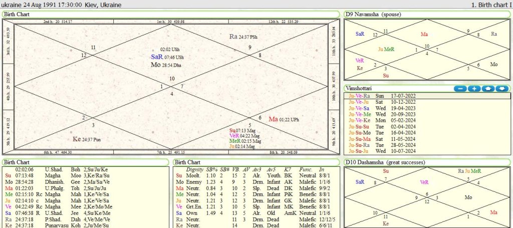 Ukraine: Ukraine has Capricorn lagna with lagna lord Saturn retro conjunct with 7th lord Moon in lagna .Saturn retro entered Capricorn on 12- 7-2022 in lagna of Ukraine over natal retro Saturn and Moon 7th lord .The war between Russia and Ukraine turn more aggressive as Saturn retro in transit have activated the war combination of Ukraine which were formed by 7th lord of open war Moon conjunct with retro Saturn in lagna .Where will this war will lead to when mars in transit will get in retrogression on 30-10-2022 in Gemini sign and will enter Taurus sign and will remain retrograde there upto 13-1-2023 will create lot of trouble for Ukraine from Russia. Mars will retrograde on 30-10-2023in Gemini sign in 6th house over natal Rahu-Ketu axis . Sixth house itself represent war . Vimshotari mahadasha-anter-pratyaanter at present running in the horoscope of Ukraine is Jupiter-Venus-Rahu from 17-7-2022 to 10-12-2022.Natal Rahu will activate transit Mars in 6th house of war from 30-10-2022 in retrogression from 7th aspect from 12th house. So 12th house signification of Rahu will be transfer into transit Mars in retrogression in 6th house which indicate loss of life and money of Ukraine in war against Russia. Sign despositor of retro Mars from 30-10-2022 to14-11-2022 will be in 8th house with Sun,Venus and retro Mercury itself and Jupiter indicate lot of help which Ukraine will get from western world in war against Russia .Mars in retro motion will enter Taurus sign on 14-1-2022 in 5th house where it will not aspect by any natal planet. Sign depositor of transit retro mars is venus is in 8th house of secrecy conjunct with Jupiter,Mercury retro Sun .These planetary combination indicate lot of help from western countries but its defeat from Russia indicate loss of life and money which is represented by 8th house.