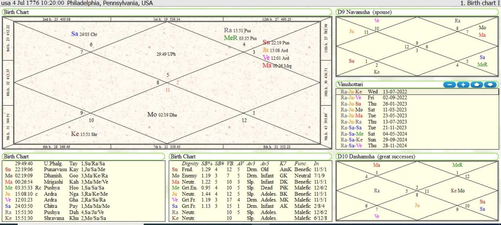 America has got Leo lagna with lagna lord Sun in 11th house of gain conjunct with Venus ,Jupiter ,Mars and aspect of Saturn from 2nd house make it a very creative horoscope .At present in the horoscope of America vimshotri mahadasha-anter of Rahu-jupiter 28-6-2021 to21-11-2023 will help America to win a war by backing Ukraine against Russia. It is due to reason its main enemy is not Russia but it is China.