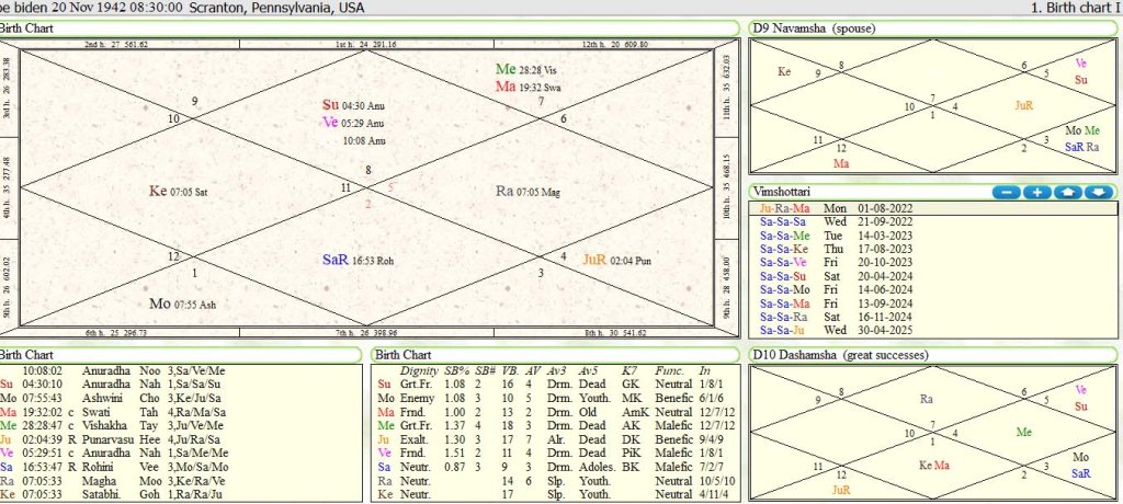 President Joe Biden :President Joe Biden has got Scorpio lagna with lagna lord in 12th house conjunct with 7th and 12th lord Venus .Lagna has got Sun 10th lord conjunct with mercury 8th and 11th lord aspect retro Saturn 3rd and 4th lord from 7th house. Mars in retrogression in transit in 8th house in Gemini sign and sign depositor is mercury is forming vipreet Rajyoga in 12th with lagna lord Mars. This is tough time for President Joe Biden in international politics to support Ukraine against Russia and Taiwan against China. Since sign despositor of transit Mars is natal Mercury conjunct with lagna and 6th lord natal Mars in 12th house shows problem and obstacles in international politics against his miscalculated decision over Ukraine and Taiwan .For cross reference see vimshotari dasha of Saturn-Saturn-Saturn starting from 21-9-2022 to14-3-2023 is sensitive due affliction to Saturn retro in birth chart and d-9 navamsha chart by Mars from sixth house .He[president Joe Biden] should take care of his health .When retro Mars in transit enter on 14-11-2022 in 7th house primary markesh house of birth chart of president Joe Biden. It will provide bad health and difficult will arise in his profession in this transit of retro Mars from 14-1-2022 to 13-1-2023 over natal retro Saturn in 7th house which is opposed by Sun and Venus from lagna in one –seven axis of his horoscope .