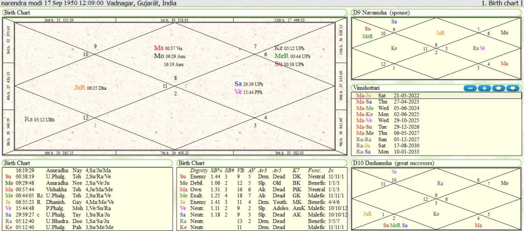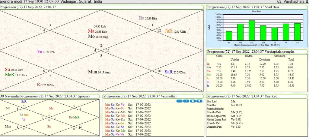 Our prime minister PM Narendra Modi will be entering seventy third year crossing seventy second year.In seventy second year was somewhat tough for PM Narendra Modi due to rising communal tension in India. Financially India has progressed under the guidance of PM Narendra Modi in his seventy second period. Bjp has won in four states in Mar-April 2022 assembly election in Uttar Pradesh ,Manipur ,Uttrakhand,Goa .BJP also has gained in maharshtra in .PM Narendra Modi is not only the prime minister of India but also a well known politician all over the world. His eadership has been hailed by world leaders , international agencies and many more The coming seventy third in dasha chiddra in twelfth year progression of lagna Lord Mars and also padd dasha of lagna lord Mars in Bhrigu Astrology is over by 17-9-2022.For assessing what star foretell about PM Narendra Modi future in seventy third year we will have to analyze Sudershan Chakra and Varshphal for 73rd year has to seen .