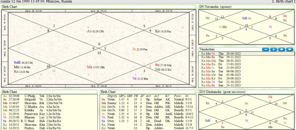 President Vladimir Putin :Russian president Vladimir Putin has Scorpio lagna and Solar Eclipse of 25-10-2022 will occur in 12th house over natal Venus and Mercury in 6/12 axis.This Solar Eclipse is occurring in 6th house from natal moon sign. Solar Eclipse occurring in 6/12 axis from lagna and natal moon sign is ominous .At present President Vladimir Putin is running Vimshotari Mahadasha of Mercury-Mercury-Jupiter from 9-9-2022 to 4-1-2023 in his birth chart.Solar eclipse has influence over Mahadasha and anter lord Mercury in 12th house conjunct with 12th lord Venus. Solar Eclipse of 25-10-2022 will aggravate the anger of Vladimir Putin over Ukraine due to aspect of transit Saturn over this Solar eclipse from 3rd house in Capricorn sign .Mercury is conjunct with Venus and aspect by retro Jupiter from 6th house and in this axis of 6/12 no malefic planet is aspect to combination of partial Solar Eclipse .So he will win Russia –Ukraine war as Mercury mahadasha lord and anter lord is 11th lord of gain in 12th house of foreign land .He has already win in September 2022, territories of Ukraine .In mahadasha of Mercury –Mercury-Saturn from 4-1-2023 to 24-5-2023 he [Vladimir Putin ]will be more successful in occupying more territory of Ukraine .In other words Solar Eclipse has positive impact over Russian president Vladimir Putin in future.