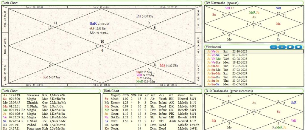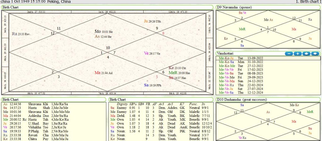 China:China has got Capricorn lagan with lagna lord in 8th house and lagna has got Moon aspect by debilitated Mars.Recent eclipse of 25-10-2022 is occurring in 10th house over 10th lord Venus is ominous for top leadership of China. Solar Eclipse in aspect by natal mars and natal Saturn indicate something big will happen in mahadasha -anter-Pratyanter of Mercury-Venus -Venus from 17-2-2023 to 8-8-2023 .It may involve Taiwan aggressively giving challenge to America .It may also raise small conflict in Indo China Border.