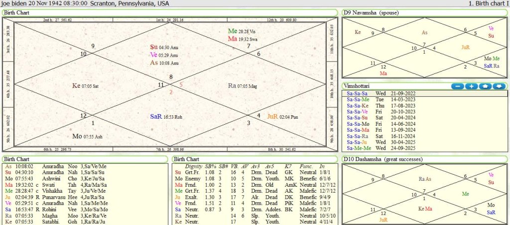 President Joe Biden:USA president has Scorpio lagna with lagna lord Mars posited in 12th house with 8th and 11th lord Mercury aspect by 9th lord Moon in 6th house. Present Solar Eclipse of 25-10-2022 is happening in 12th house in Libra sign and Swati Nakshatra over lagna lord Mars. Nakshatra of lagna lord Mars is also Swati. This eclipse is happening in 12th house and 12th lord Venus is conjunct with Sun 10th lord in lagna .Venus sign despositor of Solar Eclipse is afflicted in Sun and Saturn retro opposition in 1/7 axis/also this Solar Eclipse is happening in 7th house from moon lagna. All this combination is indicating President Joe Biden is committing a mistake in the past and in future in dealing Ukraine and Russia war.He will not get enough success in war front by supplying weapons to Ukraine .He will take controversial decision due to the effect of Solar Eclipse .Coming election in U.S.A his party will not perform well due to the effect of Solar Eclipse of 25-10-2022 which is occurring in 12th house of loss and embracement .His policy foreign policy to deal with Pakistan and India by supporting Pakistan against India will not be successful. As he is running Vimshotari Mahadasha-Anter –Pratyaanetr of Saturn –Saturn –Saturn from 21-9-2022 to14-3-2023 which maarkesh mahadasha for Scorpio lagna.Coming pratyaanter of Mercury 8th and 11th lord conjunct in 12th house with lagna and 6th lord Mars will give the result of Solar Eclipse