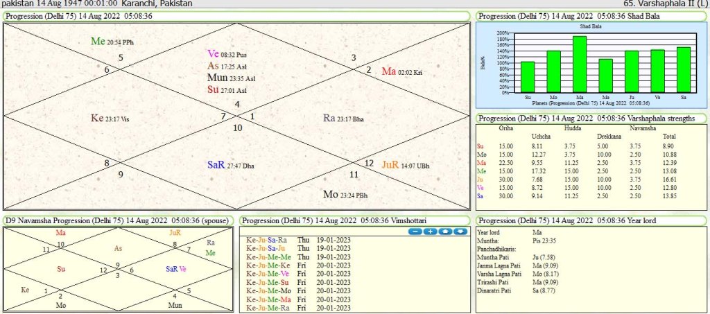 Venus mahadsha lord is 4th and 11th lord of present Varshphal. Venus 4th lord is badly afflicted in 1/7axis of Sun-Saturn retro opposition. Venus as 4th badly afflict the internal domestic environment of Pakistan.As 11th lord due to affliction it is not getting any grant from its international community .Venus in d-9 progression is debilitated in lagna afflicted again conjunct with Saturn retro 5th and 6th lord of enemy and border fight. Saturn retro is opposed from its worst enemy Sun from seventh house of opposition .This will be the worst year for Pakistan.