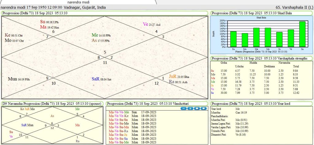 Coming Varshphala of 74th year rising will of Leo lagna in which one point is striking 10th lord is posited in 12th house in Cancer sign. In navamsha d-9 progression 10th lord is Mars in 12th house aspect by Saturn retro from 6th house indicate hard efforts win at the time of Loksabha elction of 2024.Now comes to Leo lagan with Lagna Lord Sun conjunct with Mars Yogkarka for Leo lagna .Lagna has got Mercury 3rd and 12th lord indicate name and fame overseas. Jupiter retro also aspect Lagna and Mercury in lagna which will save PM Narendra Modi from ill effects of ,Mercury 12th Lord in lagna. Since Saturn as 7th and 8th lord retro in 7th house so opposition all over India will give tough fight to PM Narendra Modi but PM Narendra Modi will win despite of all odds it is due to reason divine intervention will come to save PM Narendra Modi due to weakness of 10th Venus in 12th house.PM Narendra modi has divine coverage of lord Mahakaal [lord Shiva ] which will gave divine grace in form of saving his prime minister ship at the time of Loksabha election of 2024.