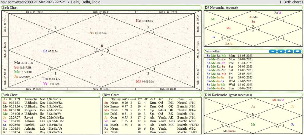 Nav samvat hindu [ 2023-2024] is starting on 22-3-2023 at 22:52 hrs Delhi India.With Scorpio lagna rising with lagna lord mars in 8th house and aspect of Saturn in Aquarius on lagna has great significance.
