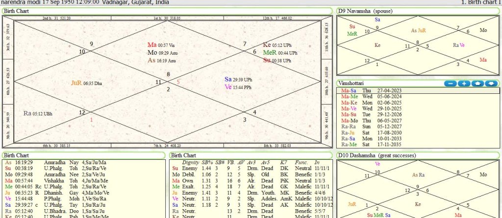 Anter of Saturn :Saturn anter lord is 3rd lord of efforts and 4th is lord of throne of king. Saturn is conjunct with Venus in 7th and 12th lord in 10th house of profession .Saturn in turn aspect by Jupiter 2nd and 5th lord in 4 +10 axis of profession .Saturn 4th lord a Kendra and Jupiter as 5th lord are forming a Rajyoga of Maharishi Parashar in 4/10 axis of profession this is very good condition for PM Narendra modi to win next loksabha election of 2024.Saturn Is posited in d-9 navamsha 2nd house as 3rd and 4th lord 6/8 position from mahadasha lord Mars which is posited in 9th house debilitated .This will leads to lots of opposition and trouble to PM Narendra Modi in this anter of Saturn running upto 5-6-2024 .In d- 10 dashmansha it posited in 6th house of enemy conjunct with 9th and 10th lord Sun and Mercury respectively .This combination of Saturn ,Sun,Mercury in 6th house will lead to win of PM Narendra Modi with lots of trouble and opposition in running anter of Saturn……