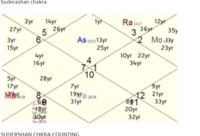 [Sudershan chakra work in very simple manner. First year represent fist house ,second year represent second house so on keep on counting up to twelfth house .Then thirteen year comes to lagna fourteen year comes to second house and twenty forth comes to twelfth house .Twenty fifth year again lagna like this keep on progressing ]
