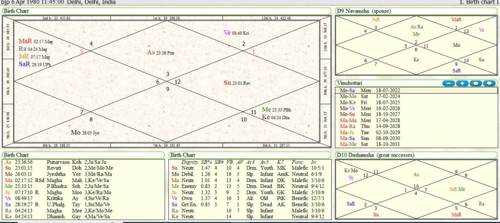 Present running mahadasha and anter in horoscope of BJP:Moon- Saturn from 18-7-2022 to17-2-2024 then Mercury anter will start from 17 -2–2024 to 18-7-2025 at the time of Loksabha election to be held on April or may 2024 .