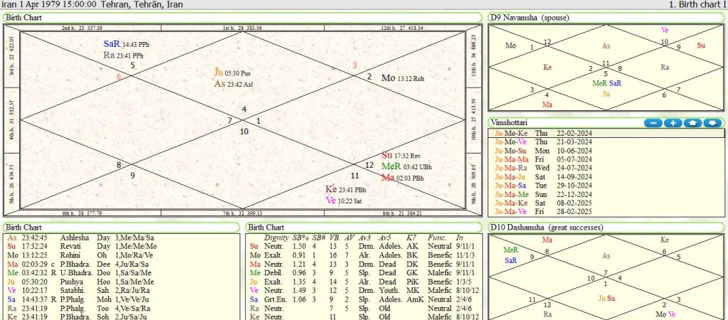 Iran: Iran came into existence on 1-7-1979 15:00hrs ,Tehran, Iran .Cancer lagan or ascendant was rising with Jupiter 6th and 9th lord posited in it. Lagan lord moon is posited in 11th house exalted .Navamsha d-9 rising is Aquarius which is 8th house of lagna. This combination indicate trouble in Iran this way or that way. The United States has imposed sanctions against Iran in response to the Iranian nuclear program and Iranian support for Hezbollah, Hamas, and Palestine Islamic Jihad, that are considered terrorist organizations by the United States. Due to these combination of 8th house of birth chart is rising as lagna of navamsha chart d-9 .At present Iran proxy Hezbollah,Hamas,Houthi are pro active to destroy Israel. These combination will be responsible in coming time for partial destruction in Arab world. At present Iran is running vimshotari mahadasha and anter of jupiter –Moon from 6-3-2024 to 5-7-2024.Jupiter is 6th lord which indicate war like condition in coming time in the horoscope of Iran. Mahadasha lord Jupiter is 6th lord which indicate war,border fights ,enemy. Anter of Moon is anter of lagna lord posited in 11th house.Upto 5-7-2024 war will not take place in anter of Moon. But with the crossing of anter from Moon to debilitated Mars which is posited in 6th house of navamsha d-9 chart in the horoscope of Iran .In this anter of Mars which is posited in 9th house in the birth chart of Iran war may escalate with America and Isreal.In birth chart Mars is aspect by 6th lord Jupiter which is posited in lagna will disturb the Arab world.Transit of Saturn and Jupiter. Saturn transit in 8th house over natal ketu which is responsible for decline of Iran in coming time from the status of BOSS in Arab world. Saturn in Aquarius in 8th house is aspect by natal Saturn and over natal Venus indicate Iran will receive help and moral support from its friends like Russia and China . Jupiter transit in Aries in 10th house .Its natal depositor is Mars which is posited in 9th house with retro debilitated Mercury is 3rd lord [which indicate Israel ]and 12th lord [which indicate loss in war in coming time] .Aspect of natal Jupiter 6th lord [which indicate war]on natal Mars in 9th house sign depositor of transit Jupiter increase the war wilingness of Iran with America and Israel.