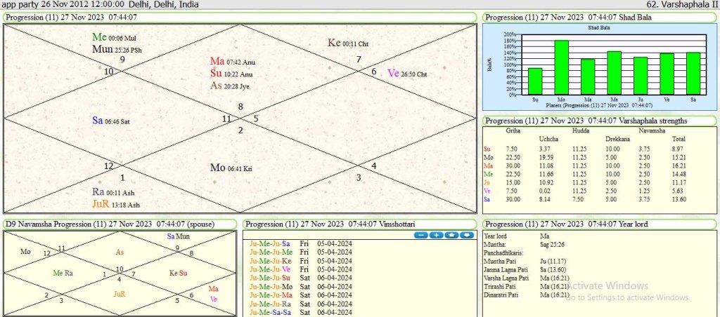 Modified Sudearshan Chakra for 12th year:In modified Sudearshan Chakra progression from lagna will reach to 12th house of loss at the time of Loksabha election.12th house contain Mars 4th and 11th lord .presence of malefic Mars is not good at the time of progression.12th house represent jail and Aap supreme Arvind Kejriwal has been landed in jail in liquor scam of Delhi. Aspect of another malefic Saturn on 12th house spoil its last chance to win Loksabha election of 2024.Jupiter 12th lord is retro in 5th house conjunct with ketu and aspect by 8th lord Sun from 11th house.Four malefic Planets influence over 12th year in progression is worst will happen in time to come.
