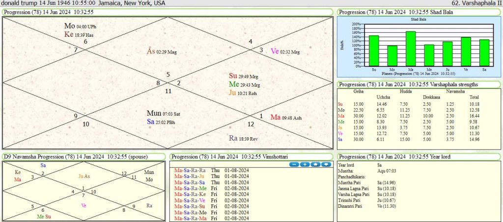At show running varshphal 79th year in the horoscope of Donald Trump .Leo lagna is rising. This is Dwi janam lagna. Donald Trump has faced a life threat by an unknown gunman. He was saved by a miracle in this running 79TH year Varshphal. In this year, Donald Trump will win the presidential election. He will defeat an unknown presidential candidate of the Democratic party in the Nov-2024 election of America..In 79th year lagna lord Sun is well posited in 10th. The 5th and 8th houses are influenced by Jupiter. Mercury is lord of 11th and 2nd houses. These are two benefic planets. 10th lord Venus is posited in 11th house of gain. This combination shows gains to Donald Trump in this coming presidential election of the USA of Nov-2024