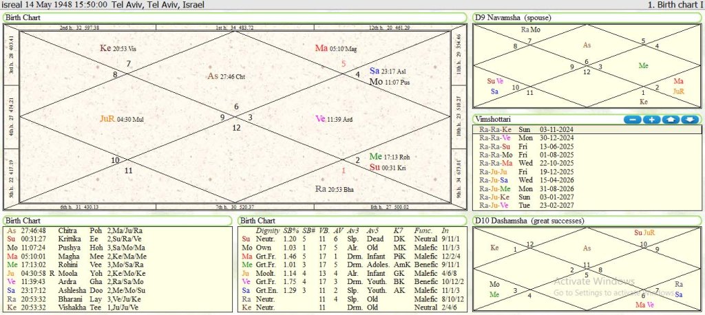 Mahadasha of rahu:Rahu mahadasha lord is placed in 8th house of secret enemy mostly hidden. Three H backed by Iran are attacking Israel from underground tunnel network.[in which ceasefire has been done on 27-11-2024 with hizbullah will not last long in future]8th house is also the house of loss but aspect by Saturn from 11th house of gain. Saturn is 5th and 6th lord of enemy conjunct with moon in 11th house of gain. Rahu depositor mars is posited in 12th house of foreign help from America.12th in which mars is posited also represent loss of life and enemy. Rahu is posited in bharani nakshtra of Venus which is 2nd and 9th lord of religion. Israel is fighting with Muslim world who are fighting Israel backed by Iran purely on religious basis. Rahu is posited in d-9 navamsha chart d-9 with the 11th lord moon in the 2nd house. This shows gaining greater Israel by winning land of adjoining countries. In the d-10 dashmansha chart, Rahu is posited in the 9th house with exalted Saturn. This is a good sign for Israel winning land for a greater Israel.