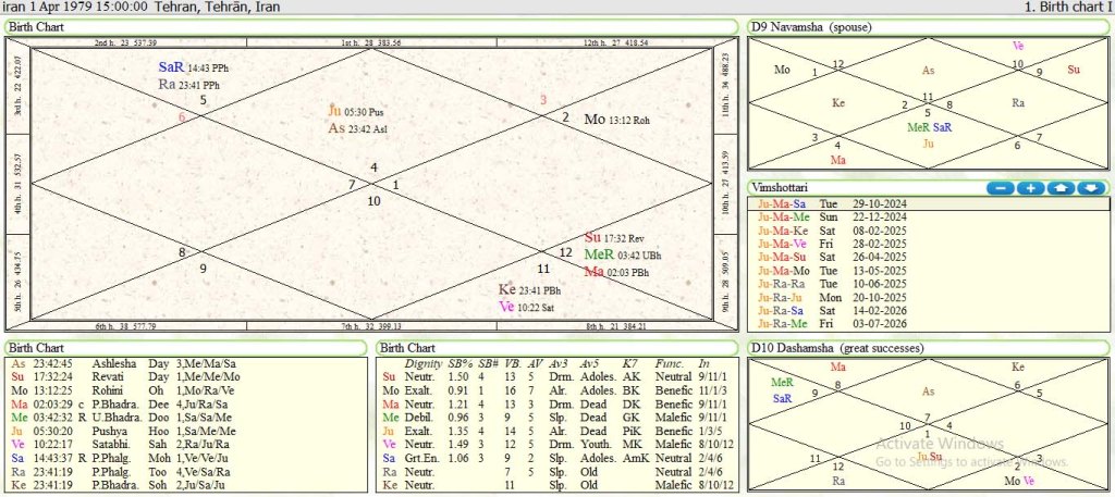 Prtyaanter of ketu: Ketu prtyaanater lord is posited in 2ND house markesh for Virgo lagna. Ketu sign lord is Venus. Venus is well posited in 10th house. This placement gives the king, or Benjamin Netanyahu, inner strength to honestly defend his country against Iran. Ketu is posited in 4th house from moon lagna. Venus, the sign lord of Ketu, is posited in 12th house from moon lagna. This shows a change of boundaries of Israel soon. Ketu is posited in 8th house in d-9 navamsha chart. Ketu is aspected by the moon, the 11th lord of gain from the 2nd house. This shows gain of land or greater Israel in the future. Ketu sign lord is Mars. Mars is posited in the 9th house. This denotes Israel is fighting against the jihad of the Islamic world led by Iran.