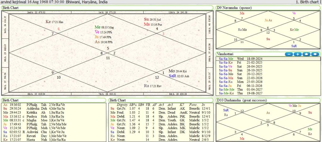 Saturn Mahadasha lord is 6th and 7th lord conjunct with 12th Moon in 9th house of Luck.As 6th it can put legal troubles to Arvind kejriwal and as Saturn has conjuct with 12th lord Moon which land him into jail in an enmity with BJP. Since Saturn is conjunct with Moon which is 12th lord also which is another house loss which may lead to Aap party in Assembly Election of Delhi .Saturn is posited in d-9 navamsha chart in 8th house in opposition from mars from 2nd house. Saturn as 6th lord of navamsha d-9 chart has aspect to 10th and 10th lord mercury which denotes downfall of Aap in this present coming Assembly election in Delhi. Saturn in d-10 Dashmansha chart is in 3rd house as lagna and 12th lord of Dashmansha Chart .Mercury 8th lord also aspect to Saturn in 3rd house. So 12th and 8th house signification are coming in Mahadasha of Saturn retro in d-10 dashmansha chart.