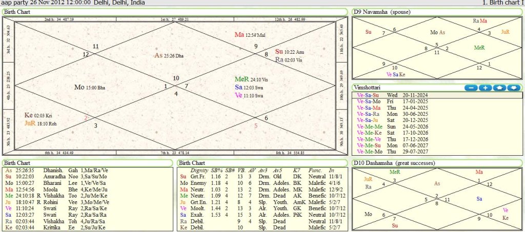 Mahadasha lord Venus :Mahadasha lord Venus is Yogkarka for Capricorn lagna posited in 10th house forming Rajyoga for Aap party..It is also in 7th house as 7th lord from Moon lagna with Saturn and retro Mercury.7th lord as Venus from Moon lagna is treated as prime Maarkesh for Aries Moon lagna. In d-9 Navamsha Chart Venus is placed in 6th house of enemy ,dispute, contesting Election .Here position of Venus is very bad as 10th lord. It is very badly afflicted in Saturn –Mars opposition ,Rahu and Ketu is also colliding in this affliction of Venus in Saturn –Mars opposition in 6/12 axis. In Dashmansha d-10 chart Venus is bad Paapkatri between Saturn in 2nd house and ketu is behind Venus degree wise.Over all position is not good for Aap party at the time of contesting assembly election in Delhi……………..